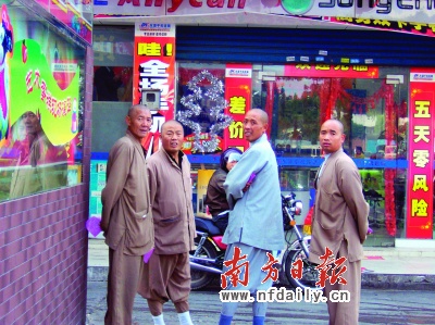 昨日上午10點30分,記者在丹灶街頭采訪時,巧遇一群“和尚”打扮的人,他們在丹灶城區(qū)商業(yè)大街的一些店鋪或商場間穿梭,時而分頭行動,時而又聚在一起,行色匆忙。