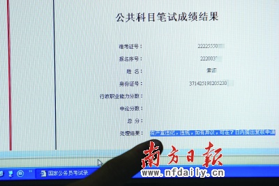 吉林某大學研一女生王藝的遭遇更具有黑色幽默。她說,報考去年的國家公務員考試她都沒有好好準備“有一半題都是蒙的,感覺A好就選A”。1月9日通過網(wǎng)上查分,“公共科目筆試成績結(jié)果”的網(wǎng)頁打開時她幾乎崩潰:“ 行政職業(yè)能力測試分數(shù)”得分為0,“處理結(jié)果:有嚴重違紀,違規(guī),如有異議,可在7日內(nèi)提出復核申請”。王藝哭笑不得。