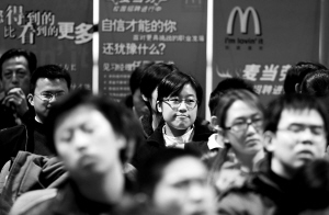 由于麥當(dāng)勞的招聘并沒有專業(yè)限制,記者注意到,在昨日的招聘會上,很多與餐飲、管理完全不相關(guān)專業(yè)的學(xué)生也坐在會場!拔沂强刂评碚撆c科學(xué)專業(yè)的”,一位北京大學(xué)的研究生小雷告訴記者,他找工作不只盯著對口專業(yè)。事實上,很多招聘單位也不再把應(yīng)聘者的專業(yè)放在最重要位置。