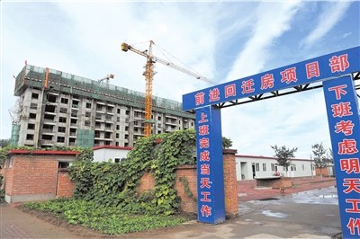 9月21日上午,記者驅(qū)車趕往太平村原址。在順義區(qū)北二環(huán)路南側(cè),記者看到,十余棟高樓已經(jīng)拔地而起,外部的墻體結(jié)構(gòu)均已經(jīng)建設(shè)完畢,但尚未粉刷。在工地的入口處,清晰地寫著“回遷房”等字樣。據(jù)工人們稱,工程是從年后開始的,曾經(jīng)在4月前后停了一段時間,后來又開始復(fù)工。