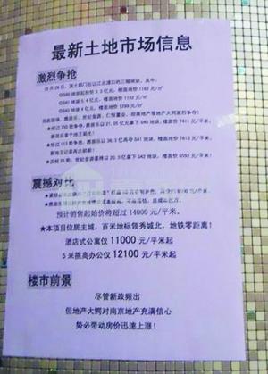 有意思的是,開發(fā)商臨時(shí)貼出了一張“最新土地市場(chǎng)信息”的公告,先說了土地拍賣的“激烈爭(zhēng)搶”和“震撼對(duì)比”兩部分內(nèi)容后,給出了“樓市前景”——“盡管新政頻出,但地產(chǎn)大鱷對(duì)南京地產(chǎn)充滿信心,勢(shì)必帶動(dòng)房價(jià)迅速上漲!”一些購房人看到后忿忿不平:這不是明擺著和政府的調(diào)控政策“叫板”嗎?開發(fā)商也太牛了吧!
