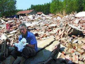 9月15日,山東諸城枳溝二村,一名農(nóng)民在瓦礫上吃午飯。他當(dāng)天在整理建筑垃圾,尋找可用的材料。本報(bào)記者 涂重航 攝