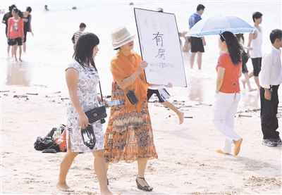 2月16日,農(nóng)歷虎年正月初三,三亞市大東海海灘。一名“炒房”者打出廣告,轉(zhuǎn)賣花高價包下的酒店房間。春節(jié)前,她以每間房1500元的價格包下了某酒店初二到初五期間的10多間房,而平時這樣的房間標價在588元。讓這名“炒房”者沒想到的是,高價包來的客房卻賣不出去了,為了減少損失,她不得不在游人密集的地方打折賣房。旅游業(yè)內(nèi)人士分析稱,三亞房價飆升有部分原因是旅行社和“黃牛黨”提前向酒店“買斷”一批高端酒店客房,然后待價而沽、大賺一筆。王凱 攝