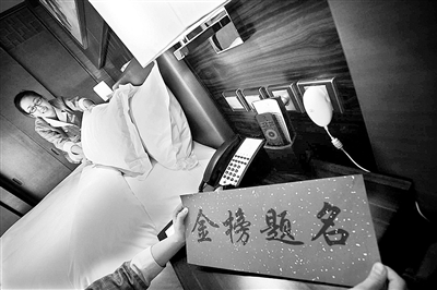 前天下午,記者在北京康源瑞廷酒店內(nèi)看到,工作人員將一張寫有祝愿考生“金榜題名”字樣的卡片擺放在床鋪和床頭柜等明顯位置,使得房客一進門就能看到。
