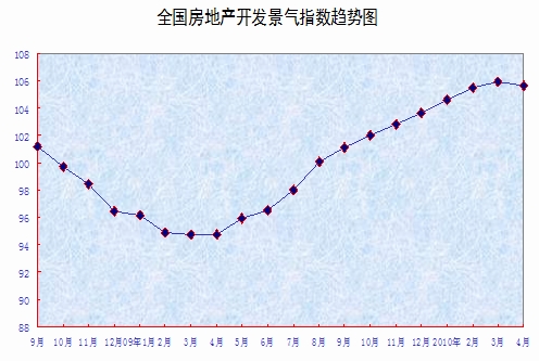 中新網(wǎng)5月11日電 據(jù)統(tǒng)計局網(wǎng)站消息,4月份,全國房地產(chǎn)開發(fā)景氣指數(shù)(簡稱“國房景氣指數(shù)”)為105.66,比3月份回落0.23點,比去年同期提高10.90點。