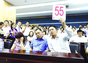 55號(hào)舉牌的是一位戴著眼鏡的年輕男士,只要聽(tīng)到主持人報(bào)出一個(gè)號(hào)碼,就立刻舉牌,基本不與身邊坐著的人談話,志在必得;他身邊的中年男士保持微笑,中年女士則神色凝重低頭看手機(jī)。坐在最后一排的1號(hào)單位代表是一位頭發(fā)花白、約50歲開(kāi)外的男士,他甚至看也不看一眼坐在前方的1號(hào),緊緊地盯著臺(tái)上的主持人,只要主持人報(bào)出價(jià)格,立刻將手中的號(hào)碼牌舉過(guò)頭頂,動(dòng)作干脆利索。