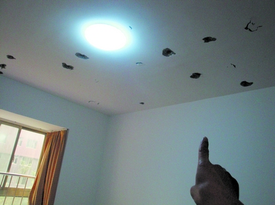 12月7日中午,在物業(yè)公司服務(wù)的王小姐走進(jìn)租住的岳麓區(qū)西岸潤(rùn)澤府小區(qū)6棟307房,立即發(fā)出一聲尖叫,她發(fā)現(xiàn)自己本來干凈整潔的床鋪上散落著大大小小的水泥塊,而本來光潔白亮的天花板出現(xiàn)了幾十個(gè)洞!爱(dāng)時(shí)第一感覺以為是發(fā)生了地震。細(xì)數(shù)發(fā)現(xiàn),竟有29個(gè)洞。”合租的一男孩子告訴記者。后來大家明白了,這是樓上裝修引起的問題。