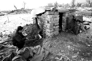 昨日中午,青磚窩棚在廢墟的白雪包圍下,冒起炊煙,崔存玲在一個缸子里烤起饅頭,準(zhǔn)備著和丈夫的午飯。