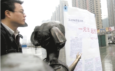 昨日10時(shí),在金水路與未來路交叉口,一男子拿著一個(gè)上寫“因地暖質(zhì)量問題,一元錢拍賣個(gè)人房產(chǎn)”字樣的牌子站在雨中,引來不少市民觀看。