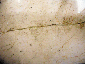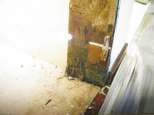 近日,記者來到羅湖寶安南路幸福里樓盤,并隨當事人李小姐前往她在小區(qū)3棟某戶的公寓。剛出電梯,一大堆裝修材料便映入眼簾,而房內(nèi)也是一片狼藉一片。在公寓內(nèi)部,堆放著一些拆卸下來的裝修材料及部件,客廳屋頂轉角處依稀有滲水的痕跡,衛(wèi)生間及廚房部分的門框都被拆掉。除此之外,當事人還向記者指點了多處大理石的裂紋。