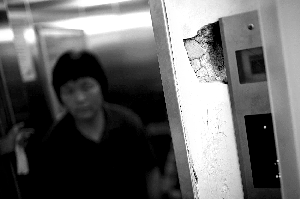 1號(hào)樓共5個(gè)單元樓門,昨日,記者在樓內(nèi)看到,單元樓門電梯間都出現(xiàn)不同程度破損,其中三單元電梯按鈕旁的墻體出現(xiàn)一個(gè)洞,里面保溫層的泡沫已露出來。五單元問題最重,火警報(bào)警器、報(bào)警燈電線外露,西側(cè)電梯門邊沿的墻皮脫落,電梯按鈕旁出現(xiàn)裂縫,電梯與地面間也有明顯裂縫。