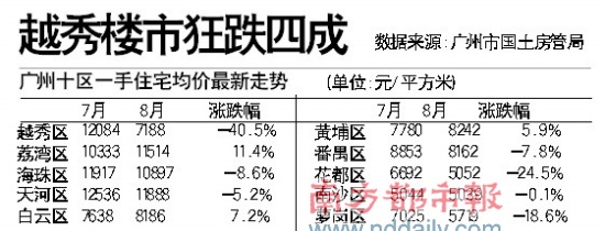 廣州越秀區(qū)房?jī)r(jià)大跳水,一手住宅均價(jià)從今年7月的12084元/平方米猛跌至7188元/平方米。廣州市國(guó)土房管局調(diào)查指出,越秀區(qū)房?jī)r(jià)大幅下降是由兩個(gè)低價(jià)樓盤(pán)的集中交易造成的,專(zhuān)家稱(chēng)可能涉及內(nèi)部交易。而廣州市日前公布的最新房地產(chǎn)市場(chǎng)分析報(bào)告顯示,廣州全市十區(qū)8月一手住宅均價(jià)小幅下降至9078元/平方米。