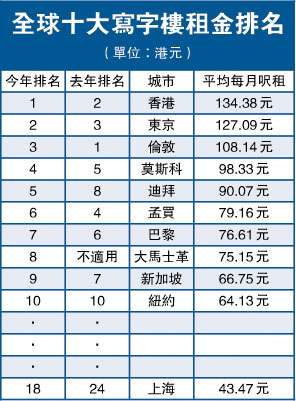 報告顯示,香港核心區(qū)域?qū)懽謽瞧骄咦鉃?34.38港元。另外,報告還顯示,上海以43.47港元的尺租排名第十八位。