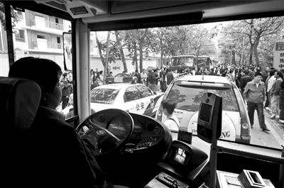 記者發(fā)現(xiàn),現(xiàn)場有9輛31路公交車被堵無法前行,公交司機(jī)們?nèi)齼蓛傻鼐墼诼愤吜奶。一名王姓司機(jī)說,他已被堵近1小時,但因車隊未允許調(diào)頭返隊,他只好原地等待。當(dāng)被問及如何處理車上乘客時,他說,由于等待時間過長,乘客只能下車步行離開此地。