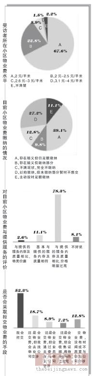 問(wèn)卷顯示,豐臺(tái)區(qū)三環(huán)新城、昌平區(qū)天通苑、龍澤苑、朝陽(yáng)區(qū)國(guó)美第一城均有業(yè)主大范圍拖欠物業(yè)費(fèi)的現(xiàn)象和相當(dāng)一部分業(yè)主拒交物業(yè)費(fèi)的現(xiàn)象。
