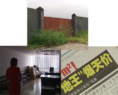 2007年9月11日,保利地產(chǎn)在一天之內(nèi)以8769和8112的高昂價(jià)格,拿下了這里的兩塊土地,成為地王,F(xiàn)在土地已經(jīng)被鐵皮墻包圍起來。大門門口雜草叢生,看起來很少有人光顧。我們找到了看守工地的施工人員。