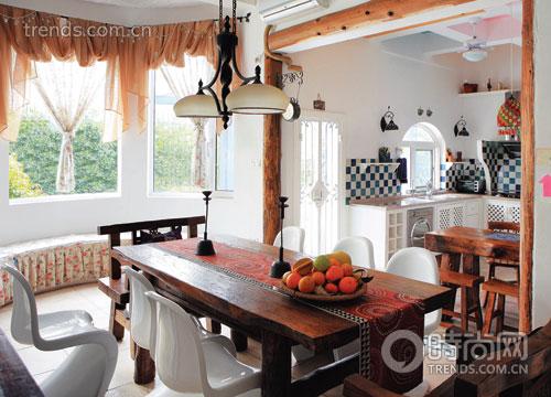 玄關(guān)是室內(nèi)的第一視覺焦點,小米用藍(lán)白兩色為這個家點了題,與房子的外立面呼應(yīng):白色的墻面,藍(lán)色的門板、鞋柜、天鵝頭木盆描繪著浪漫的地中海風(fēng)情;客廳里條紋圖案的布藝沙發(fā)和花朵圖案的布藝貴妃椅則是典型的鄉(xiāng)村風(fēng)格,主題墻上點題式地掛起兩幅與海岸相關(guān)的油畫;餐廳里,小米玩起了混搭——上等老榆木的厚重餐桌,兩頭各放一張老榆木餐椅,氣勢穩(wěn)重,兩側(cè)則是四張設(shè)計感很強的白色Panton椅,起初你會覺得有點大膽,再認(rèn)真審視,又覺得這種碰撞很和諧,小米說:“我喜歡來點驚喜的感覺,這椅子的線條很優(yōu)美,像海浪般起伏,與老榆木的感覺一個新,一個舊,一個輕,一個重,相映成趣!