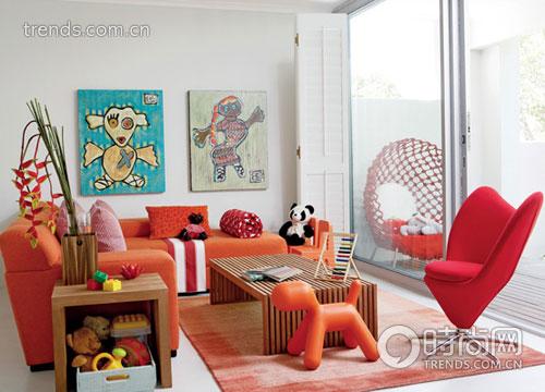 紅色跟橘色作為主調(diào)并不是很容易把握的,因?yàn)榇竺娣e此類顏色的使用容易使人感到煩躁,而這間客廳的搭配卻恰到好處。墻壁摒棄了花色的壁紙,保留純白的底色,只掛了兩幅充滿稚拙童趣的畫作,并以簡潔明快的天藍(lán)色打破視野中紅色占據(jù)的僵局。地板也做了簡單處理,只鋪一塊淺淡的扎染效果的地毯,絕不喧賓奪主。