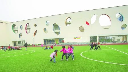 昨日下午,記者來(lái)到草堂小學(xué)翠微校區(qū),4棟通過(guò)走廊連為一體的4~5層的建筑格外引人注目。正對(duì)學(xué)校大門的墻體,鑲著10多個(gè)彩色的橢圓。設(shè)計(jì)者、西南交通大學(xué)教授王蔚介紹說(shuō),翠微校區(qū)占地20余畝,建筑面積一萬(wàn)余平方米,而總投資僅2000多萬(wàn)元!斑@些彩色的橢圓圖案,代表著水滴。陽(yáng)光下,‘水滴’呈現(xiàn)出不同顏色,這代表了學(xué)生們的不同個(gè)性。校舍以‘陽(yáng)光下的水滴’為設(shè)計(jì)構(gòu)思,充分表達(dá)了在我國(guó)素質(zhì)教育的原則下,尊重個(gè)性發(fā)展,尊重少年兒童人格特征的理念!