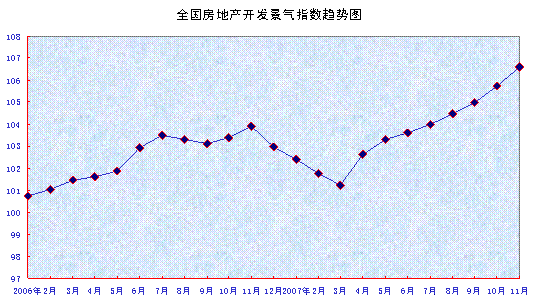 中新網(wǎng)12月17日電 國家統(tǒng)計局官方網(wǎng)站今日公布,11月份,“國房景氣指數(shù)”為106.59,比10月份上升0.85點,同比上升2.67點。“國房景氣指數(shù)”以100為臨界值,指數(shù)值高于100為景氣空間,低于100則為不景氣空間。10月房地產(chǎn)開發(fā)投資分類指數(shù)為104.42,比9月份上升0.35點,同比上升2.74點。