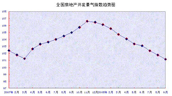 中新網(wǎng)10月21日電 據(jù)國(guó)家統(tǒng)計(jì)局網(wǎng)站數(shù)據(jù)顯示,9月份“國(guó)房景氣指數(shù)”為101.15,比8月份回落0.63點(diǎn),比去年同月回落3.84點(diǎn)。