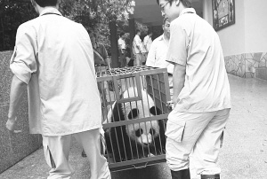 下午2時(shí),運(yùn)輸車輛經(jīng)過(guò)安檢、消毒后,從上海野生動(dòng)物園啟程,3時(shí)到達(dá)上海動(dòng)物園。在臥龍大熊貓保護(hù)研究中心的主管見(jiàn)證下,經(jīng)過(guò)上海動(dòng)物園和上海野生動(dòng)物園共同檢查,確認(rèn)無(wú)誤,完成動(dòng)物交接。隨后,工作人員開(kāi)始為熊貓串籠。10只世博熊貓似乎知道要搬新“家”,乖乖地在飼養(yǎng)員誘導(dǎo)下,一個(gè)個(gè)按照指令很爽快地進(jìn)入消毒過(guò)的籠“轎”內(nèi),安穩(wěn)地等候上車。