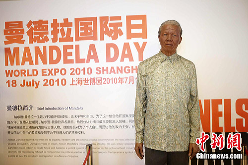 當(dāng)天,一尊來(lái)自上海杜莎夫人蠟像館的曼德拉蠟像“走入”南非館,栩栩如生的造型讓有人覺(jué)得仿佛這位“人權(quán)斗士”真的親臨世博園,游客紛紛掏出相機(jī)、駐足與偉人留影。