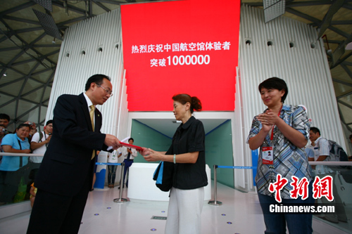 中新網(wǎng)上海8月10日電(記者 陳婷婷)10日,上海世博會中國航空館參觀體驗(yàn)總?cè)藬?shù)突破百萬大關(guān)。來自上海寶山區(qū)的陳惠珉女士成為第100萬名幸運(yùn)體驗(yàn)者。世博局浦西DE片區(qū)部陳超部長親臨現(xiàn)場向中國航空館迎來第100萬體驗(yàn)者表示祝賀。中國航空館館長周俊向陳惠珉女士贈送了“中國航空館第100萬幸運(yùn)體驗(yàn)者”榮譽(yù)證書,以及豐厚且具有航空特色的獎品。