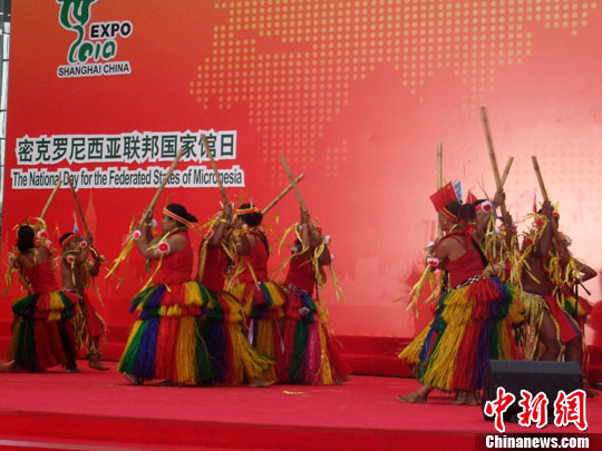 中新社上海8月29日電 (記者 鄭瑩瑩)以熱帶風情著稱的太平洋島國密克羅尼西亞29日迎來國家館日。在官方儀式上,數十名島國舞者穿著及踝草裙,手持竹竿相互敲打,以原生態(tài)歌舞展現島國熱情奔放的民俗風情。