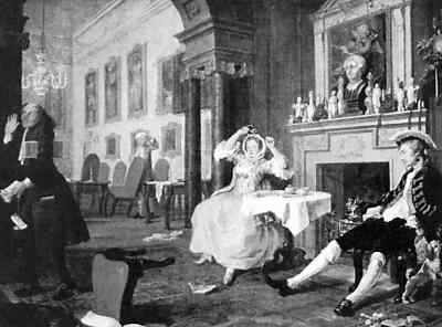 首先惹禍的是幾幅油畫作品。英國畫家威廉·霍加斯的著名作品《時髦的婚姻》在當(dāng)時被展出,這組畫共有6幅:訂婚、時髦婚姻、求醫(yī)、音樂會、決斗、自殺。正是這一組帶有強(qiáng)烈批判意義的畫引發(fā)了上流社會的不滿和爭議,紅衣大主教更是大發(fā)雷霆,下令禁士教士、學(xué)校校長和家長前去參觀,這件事在當(dāng)時也鬧得沸沸揚揚。
