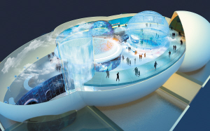 展館內部以“云中漫步”概念為主線,進入世界氣象館,參觀者仿佛搭乘“穿云飛船”置身于云層中,一路漫步“氣候變化云廊”,領略“云頂觀象”奇觀,觀測“小球大世界”實時變化、體驗“世博氣象臺”科技實力,展望“未來之家”的優(yōu)質氣象服務。