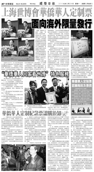 中新網(wǎng)4月8日電 《國際日?qǐng)?bào)》3月30日刊登世博專版,介紹上海世博會(huì)華僑華人定制紀(jì)念票。