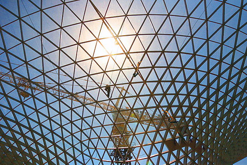 提到地下空間,大多給人的印象是昏暗與沉悶,然而世博軸的“陽(yáng)光谷”使這一問(wèn)題迎刃而解。據(jù)介紹,世博軸采用全新的建筑形式,6個(gè)巨型圓錐狀“陽(yáng)光谷”將陽(yáng)光自然引入地下,既利于空氣質(zhì)量的提高,又能節(jié)省人工照明帶來(lái)的能源消耗,為安檢排隊(duì)等候人流提供足夠舒適的空間。