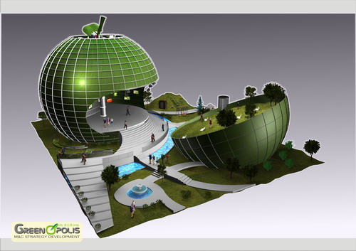 羅馬尼亞國(guó)家館的蘋(píng)果外形和標(biāo)志文字“GREENOPOLIS”體現(xiàn)了健康生活方式的重要性、對(duì)可持續(xù)發(fā)展理念的關(guān)注以及針對(duì)現(xiàn)代社會(huì)普遍存在問(wèn)題的以知識(shí)為本的解決方案。