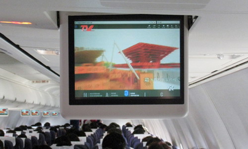 機(jī)艙內(nèi)正在播放網(wǎng)上世博會(huì)宣傳片。
