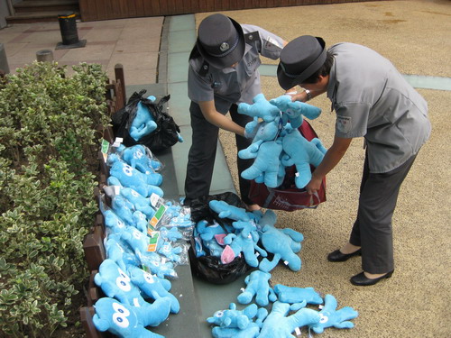 在南京路步行街管理辦牽頭下,黃浦區(qū)城市管理監(jiān)察大隊(duì)開展了對南京路步行街各類無證設(shè)攤的打擊,一天之內(nèi)就收繳了200余只假冒海寶玩具。這是城管部門在與上海世博局建立聯(lián)動機(jī)制后,首次收繳侵犯上海世博會知識產(chǎn)權(quán)標(biāo)志的商品。