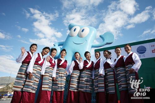 在雄偉壯觀的布達(dá)拉宮前,上海世博會的使者“海寶”張開笑臉,歡迎來自四方的游客,開幕活動儀式結(jié)束后,廣場上的民眾爭相與“海寶”留影紀(jì)念,他們紛紛表示希望2010年去上?词啦⿻。