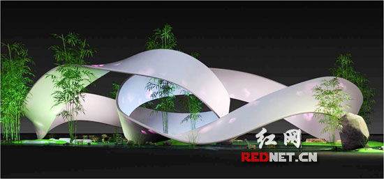 (三)彰顯湖湘文化,突出湖南元素。展館的設計形象湖南色彩濃厚,竹、紙、芙蓉花、桃花源、武陵源概念等湖南元素以及蔡倫造紙、隆平水稻、白石藝術、毛澤東故事等湖湘人文形象貫穿整個設計。環(huán)體主體材料為竹結構,且整個場館掩映于竹林碧水之間,竹使人聯(lián)想起湘妃竹、瀟湘竹海和毛主席的詩句。整個魔比思環(huán)就像展開的卷軸,環(huán)體外表用紙裝飾,紙是中國古代四大發(fā)明之一,湘人蔡倫造紙,體現(xiàn)了湖南歷來有重視教育科技創(chuàng)新的傳統(tǒng)。芙蓉花代表湖南自然、綠色形象。還有懷素的草書、齊白石和黃永玉的畫,體現(xiàn)出湖南人對自然的膜拜、對美的執(zhí)著追求。館名“桃花源里·Xanadu”更是顯現(xiàn)了桃花源的概念和世人對“世外桃源”的千年尋夢。并用這些濃厚的湖南元素設計組合,烘托出毛澤東詩句中的“萬類霜天競自由”、“桃花源里可耕田”、“芙蓉國里盡朝暉”的偉大浪漫主義情懷,把“都市桃花源”的理想境界推廣到全世界。