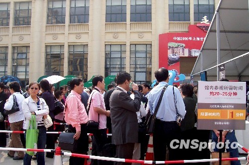 10月13日,走進(jìn)世博會(huì)——中國2010年上海世博會(huì)暨世博會(huì)歷史回顧展在上海展覽中心展出。展廳外主辦方專門設(shè)置一個(gè)白色屋頂?shù)拇笈铮蔀橐粋(gè)臨時(shí)的觀眾場外等候區(qū),參觀者服務(wù)模擬系統(tǒng)和文明觀展提醒標(biāo)識(shí),讓參觀者提前體驗(yàn)“如何參觀上海世博”。中新社發(fā) 周東潮 攝