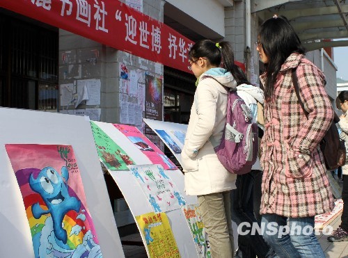 12月22日,安徽師范大學(xué)學(xué)生正在觀看“迎世博”書畫作品。當(dāng)日,安徽師范大學(xué)赭麓書畫社舉辦“迎世博 抒華章”書畫作品展覽活動,展出了86件由大學(xué)生自己創(chuàng)作的迎世博書法、繪畫作品,吸引了不少大學(xué)生的目光。隨著2010年上海世博會日益臨近,安徽師大學(xué)生舉辦了一系列活動來表達對世博會的期盼和祝福。中新社發(fā) 劉淮宇 攝