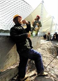 沒(méi)有老資歷的工人,卻意外遇到位老資歷的小販。世博軸邊上,在工地賣燒酒的葛師傅告訴記者,他做工人們的生意,已經(jīng)快滿三年了……