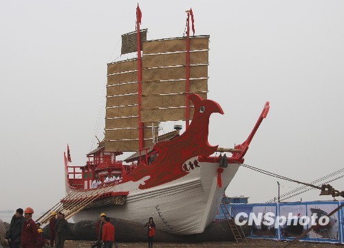 3月31日,由張家港市長(zhǎng)明造船廠仿制的“遣唐使”船成功下水。作為中日友好文化交流的象征,該船將亮相上海世博會(huì)日本館!扒蔡剖埂贝且匀毡撅w鳥時(shí)代到平安時(shí)代(公元7世紀(jì)~9世紀(jì))的遣唐使船為藍(lán)本仿制的,船長(zhǎng)32.5米、型寬6.8米,由30多名能工巧匠花費(fèi)6個(gè)半月的時(shí)間建造完工,以1:1比例還原了當(dāng)年遣唐使船的大小和結(jié)構(gòu)。中新社發(fā) 朱曉穎 攝