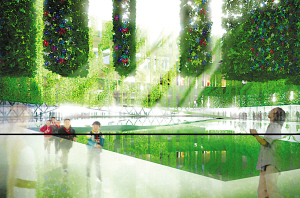 “建筑內(nèi)部的綠色立體園林,也使用了可降解、可循環(huán)的材料,以盡可能達到最大限度的環(huán)保。這些綠色的植物,除了可以讓人們親近自然,還能夠幫助調(diào)節(jié)室內(nèi)溫度,讓參觀者更加舒適。屋頂?shù)奶柲茈姵匕澹瑒t提供了清潔而免費的能源。”方可說。