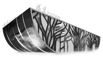 福建地處祖國(guó)東南沿海,面向臺(tái)灣海峽,依山傍海,擁有豐富的生態(tài)資源和漫長(zhǎng)的海岸線。因此,福建館整體外觀設(shè)計(jì)為船形,以“綠、藍(lán)、白”為主色調(diào),正面為綠色榕樹造型,兩側(cè)船頭為藍(lán)色大海影像墻,頂部為白色橫梁,充分體現(xiàn)福建山中有城、城中有山,城海相連、海城一色的景象。整個(gè)展館像一艘在臺(tái)灣海峽中乘風(fēng)破浪的“生態(tài)船”,展現(xiàn)了福建作為綠色大省的風(fēng)采。