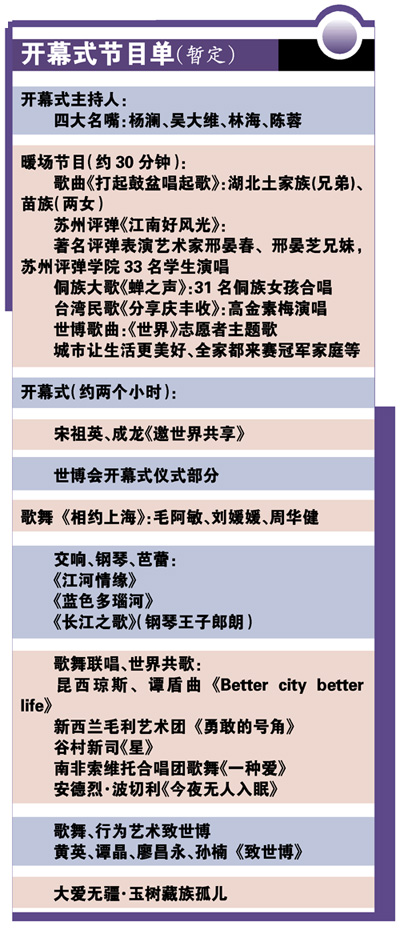 作為全世界人民的世博會,上海世博會開幕式將是中華風情和世界潮流的融合,“節(jié)目很精彩,大牌很多!眳⒓恿耸啦╅_幕式彩排的邢女士告訴記者。正式演出時,首先登場的是宋祖英和成龍,一曲《邀世界共享》,向全世界人民發(fā)出邀請。在歌聲中,56個民族身穿華服,還夾雜著雜技、飛天、長城等中國專屬符號,非常具有民族特色。隨后出場的毛阿敏、周華健、劉媛媛,用一曲《相約上!,代表了上海向世界發(fā)出世博的邀請。