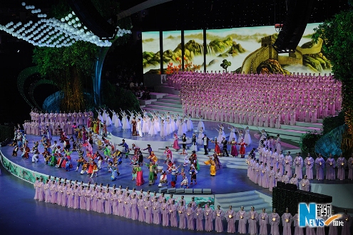 隨后,中國香港著名影星、上海世博會形象大使成龍也出現(xiàn)在舞臺上,與宋祖英一起演唱《和諧歡歌》,同時中國56個民族的舞者,也踏著慶典舞步,以中華民族共同的熱情,層層出現(xiàn)在舞臺上翩翩起舞,歡迎世界各地賓客的到來。