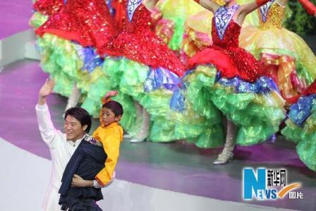 兩位來自青海玉樹地震災區(qū)的藏族小朋友也在這時出現在了舞臺上。他們與三個三口之家走到一起,五個孩子手拉著手,深情地緊緊擁抱。舞臺上的演員們“心手相連”,表達了人類必須團結一心相互支撐、攜手面對未來一切挑戰(zhàn)的寓意。