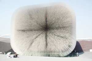 記者:我現(xiàn)在就在英國館外大概50米左右的地方,英國館占地6千平方米,是最大的自建館之一,在英國館的入口處外墻上印了這么一句話,“英國館就是英國送給中國的禮物”。為什么這么說呢,因?yàn)檎挠^的外墻就像一個剛剛打開的精致禮品包裝盒,種子圣殿就是禮物本身,在外面的露天廣場則是剛剛?cè)¢_的包裝紙,游客們可以在上面休息,孩子們可以在上面嬉戲。