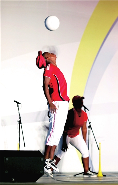 隨后,演員們在非洲廣場跳起南非世界杯的官方舞蹈。6位舞蹈演員身著紅色的南非國家隊隊服,在明快強勁的非洲音樂伴奏下跳起了足球舞,每個動作都跟足球有關,或是頂球、或是傳球、或是顛球……在場的每個人都為足球的激情所感染。