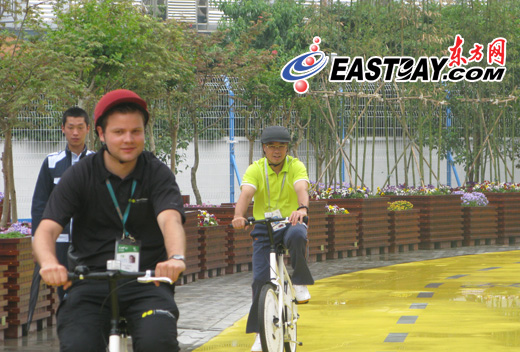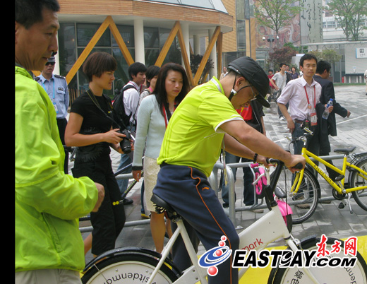 黃綠色的李寧運動短T,深色的李寧網(wǎng)球褲,白色的李寧運動鞋,再加一頂黑色的李寧鴨舌帽,今天上午10點半左右,在各路記者的簇擁下,昔日體操王子李寧出現(xiàn)在世博會浦西城市最佳實踐區(qū),從馬德里案例區(qū)出來后,出現(xiàn)在了歐登塞展區(qū),看著路邊停放著的一整排自行車,李寧也過了一把騎車癮,引起了游客的圍觀。